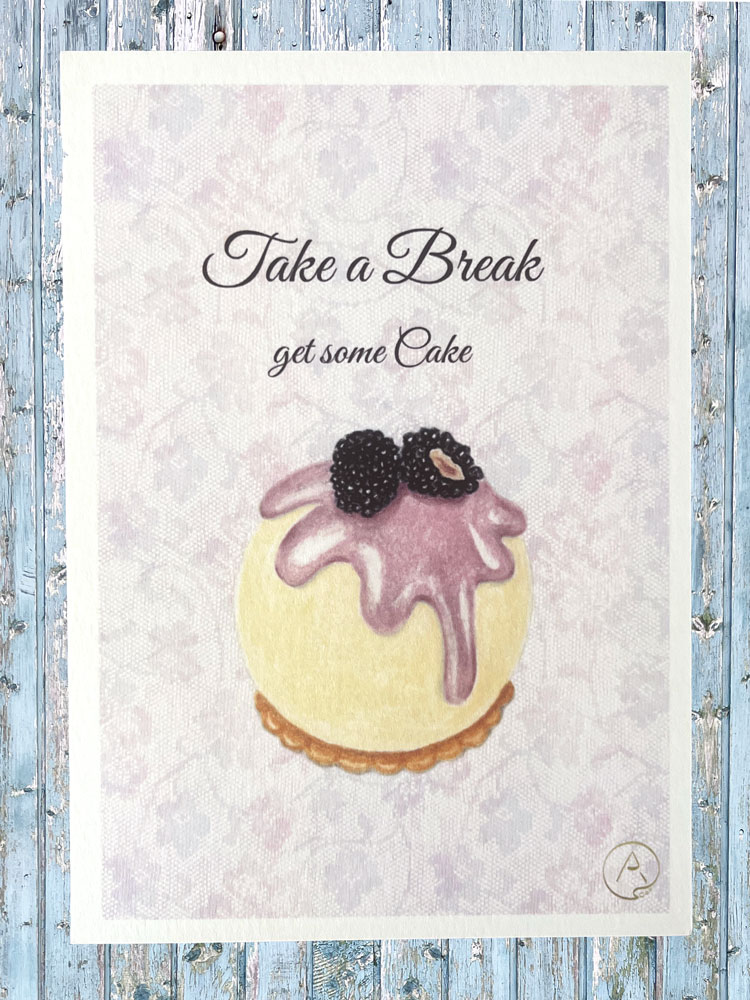 At spise kage er en fornøjelse og skal nydes. Hold pause og giv slip på alt hvad du end måtte fylde dine tanker med. Vær til stede imens, så du får hele oplevelsen af smagen og bare nyder at livet er godt. Kortet har et fint lyst print af Nordic Art Prints logo på bagsiden, som du kan skrive en sød hilsen henover og inviter en ven på kage eller det kan også være, at du selv vil have det hængende på vægen i en ramme.