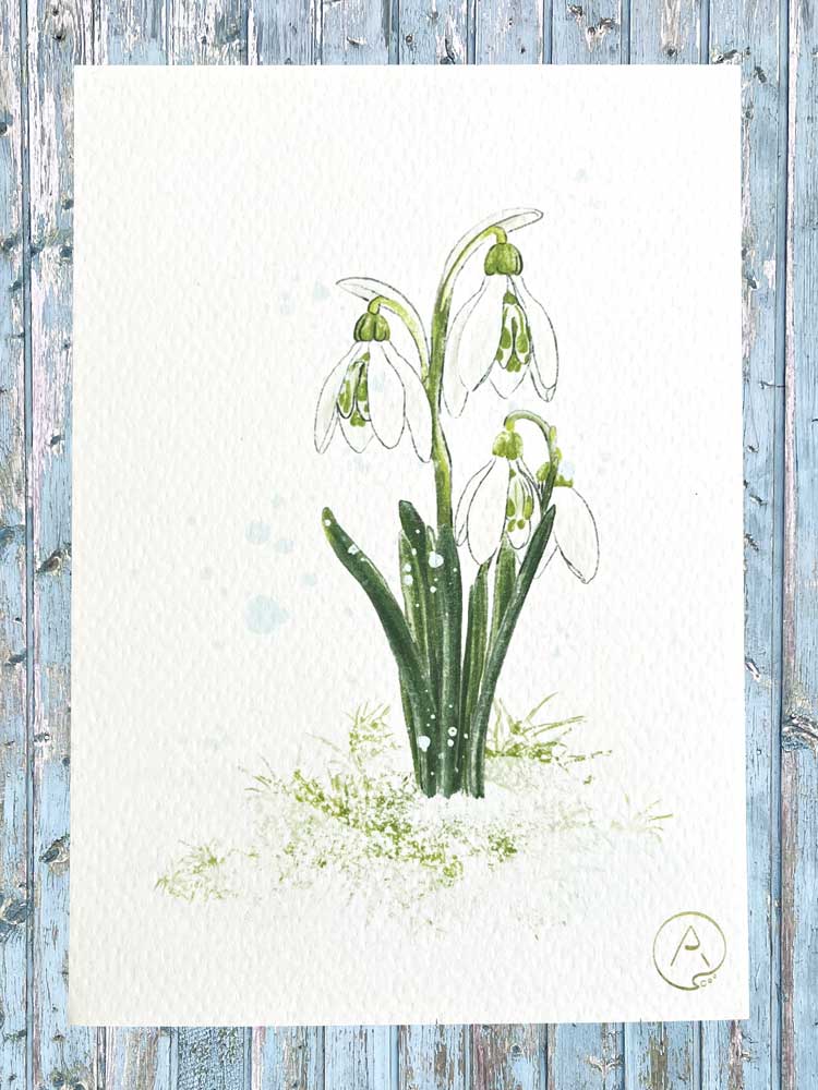 Vintergækken bryder frem, hvor foråret er lige rundt om hjørnet og sneen begynder at smelte. Her står den rank og grøn i den hvide sne, som skildres af det hvide papir.